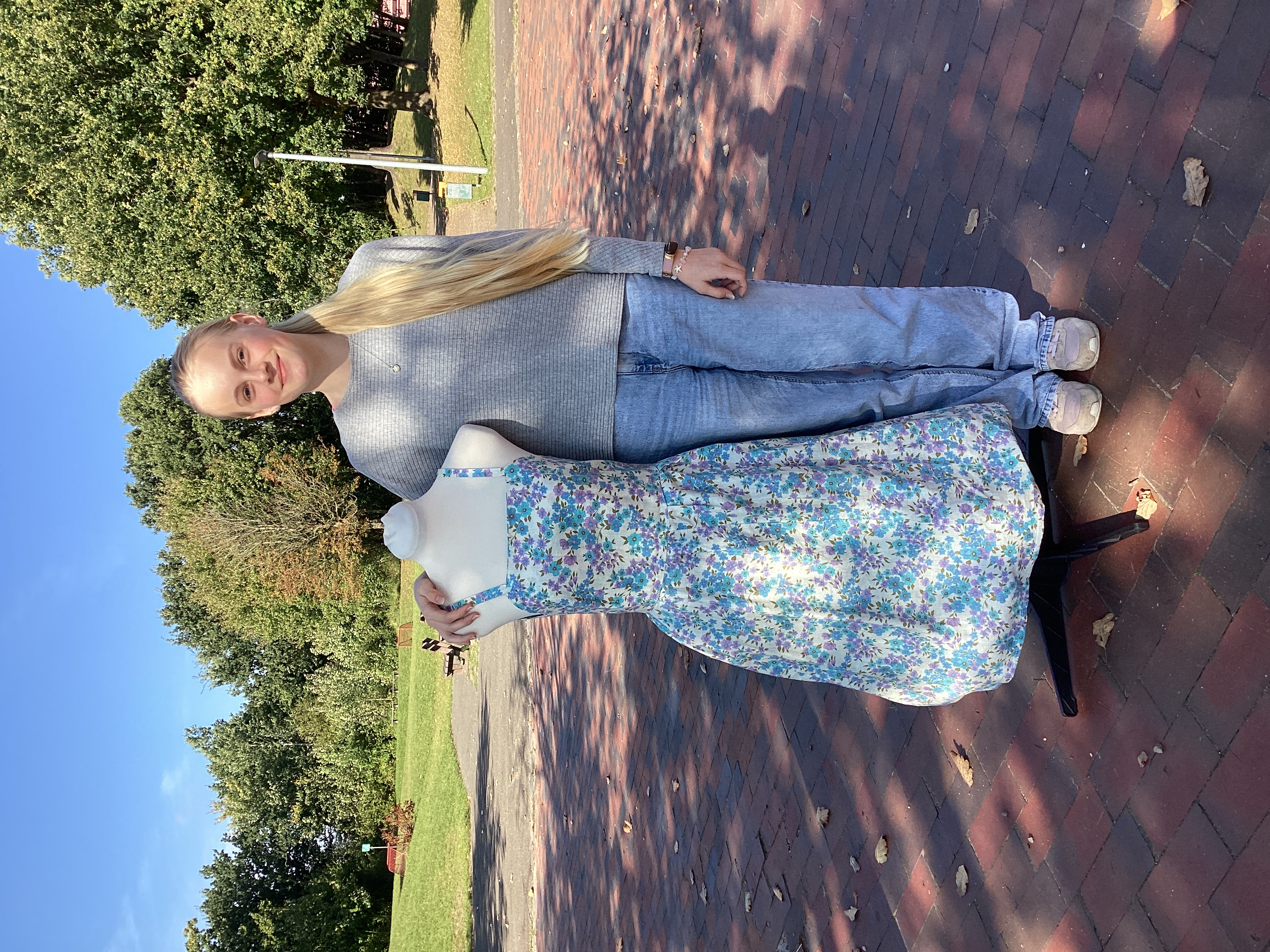 Wir hatten unseren eigenen Kursraum, wo uns etliche Stoffe zur Verfügung gestellt wurden. Einer davon stach mir sofort ins Auge, Cremeweiß mit kleinen blauen und violetten Blüten darauf. Nachdem ich mein Moodboard (Sammlung von Ideen und Inspirationen für das Kleidungsstück) beendet hatte, war ich mir sicher: Ich wollte ein Sommerkleid erstellen. Doch dies in die Tat umzusetzen war gar nicht so einfach wie gedacht, denn dahinter versteckte sich ein riesiger Haufen Theorie. Außerdem machte ich mir extra Arbeit, indem ich links und rechts in den Rock meines Kleides Taschen einplante. Aber am Ende haben sich alle Anstrengungen ausgezahlt, da ich mit dem Kleid echt total zufrieden bin.