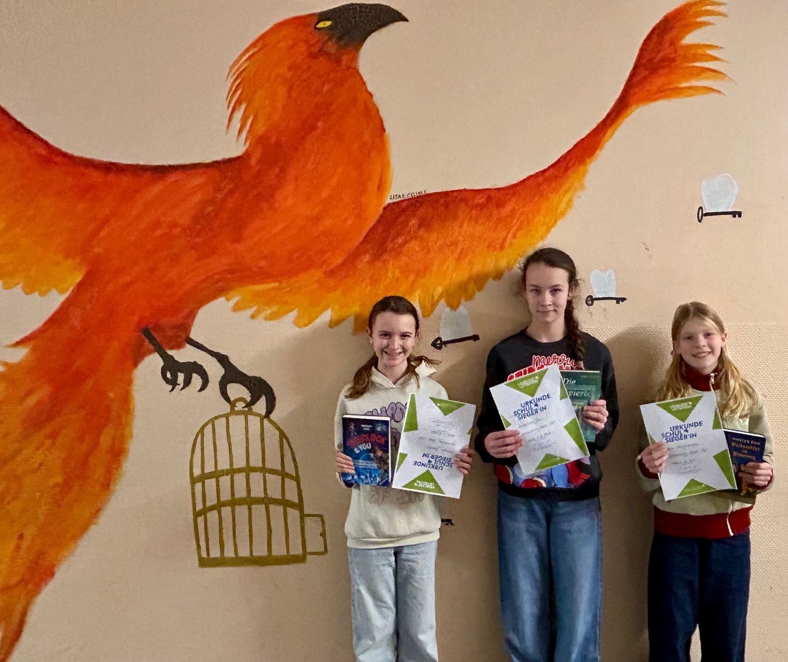 Wir danken den Klassensiegern des diesjährigen Vorlesewettbewerbes Nuri Förster (6a), Lea Dierks (6b), Mika Müller (6b), Anna Dirschauer (6c -3. Platz), Julian Resow (6c – 2. Platz), Melina Reimers (6d) und Maili Fröhlich (6d) für die Entführung in fremde Welten und gratulieren ganz herzlich der Schulsiegerin Janne Täubert (6a –1. Platz).
