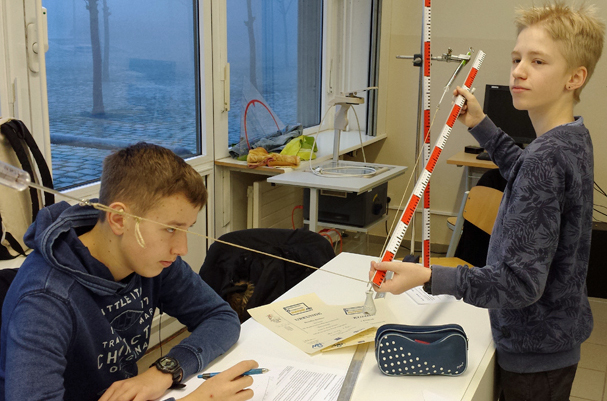 Bendix Bröker (8c) und Mark Uswak (8b) haben sich mit einem 2. Preis für die zweite Rundes des Bundeswettbewerbs Physik qualifiziert. Zu bearbeiten waren experimentelle und theoretische Aufgaben zur optimalen Nutzung von 4 Fahrradlampen mit einer 9 V Blockbatterie, zur Bau einer flexiblen Briefwaage und zu Spiegelbildern durch ein Wasserglas. In der zweiten Runde geht es mit kniffeligen Experimenten und Aufgaben weiter.
