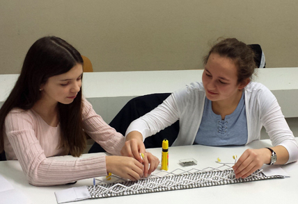 Evelyn Geiger (8c) und Denisa Jacobsen (8d) bauen am Geländer ihrer Brücke