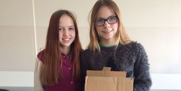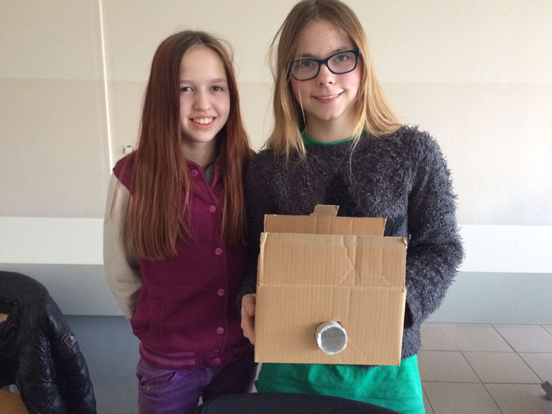 Nele Fußbahn (7d, links) und Lefke Ewaldt (7a, rechts) mit ihrem selbstgebauten Handy-Beamer.