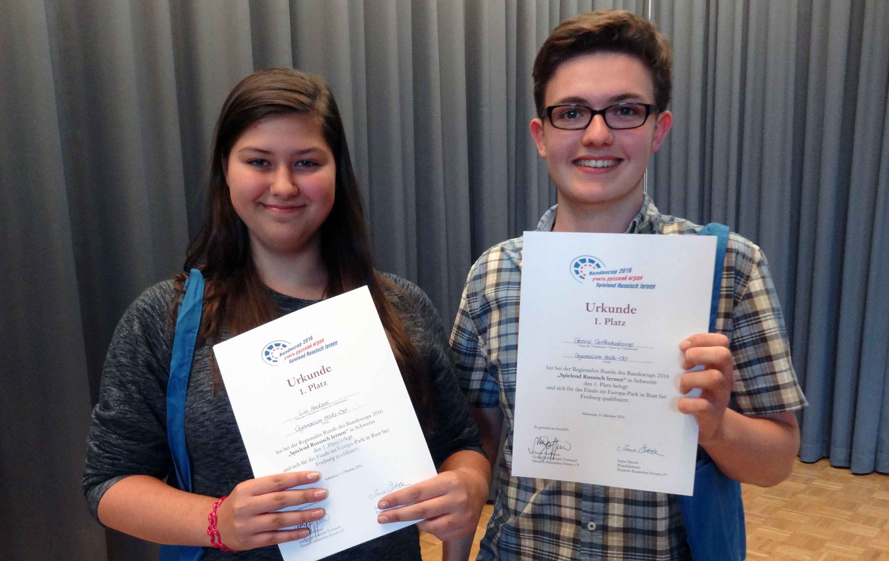 Lia Heckens und Gonne Gottkehaskamp vom Gymnasium-Heide Ost haben die diesjährige Regionalrunde des Bundescups »Spielend Russisch lernen« in Schwerin gewonnen. Das Schülerteam aus Heide setzte sich am 6.10.2016 gegen zehn weitere Mannschaften aus Norddeutschland durch.