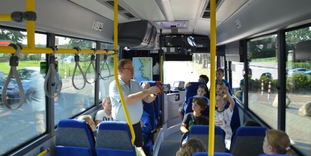Dithmarschenbus bot am 27. August die schon traditionelle Busschule an. Hier lernten und übten die Schüler*innen der vier fünften Klassen sicheres Verhalten beim Warten auf und Anstehen für den Bus und auch, wie man sich sicher im Bus benimmt. Für den Fall eines Unfalles zeigte der fahrer seinen Passagieren auch, wie der rote Nothammer zu benutzen ist. Ausprobiert wurde das jedoch nicht.