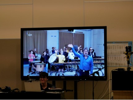 Sehr gute Arbeit hat auch unsere Technik-AG geleistet, die im Vorfeld und am Konzerttag mit den Technikprofis des NDR für einen glatten Ablauf sorgte. Oben im Bild ist die Übertragung aus unserer Sicht auf dem großen Bildschirm in Forum 3 zusehen, mit Jakob Ehlers im Einsatz an der Technik.